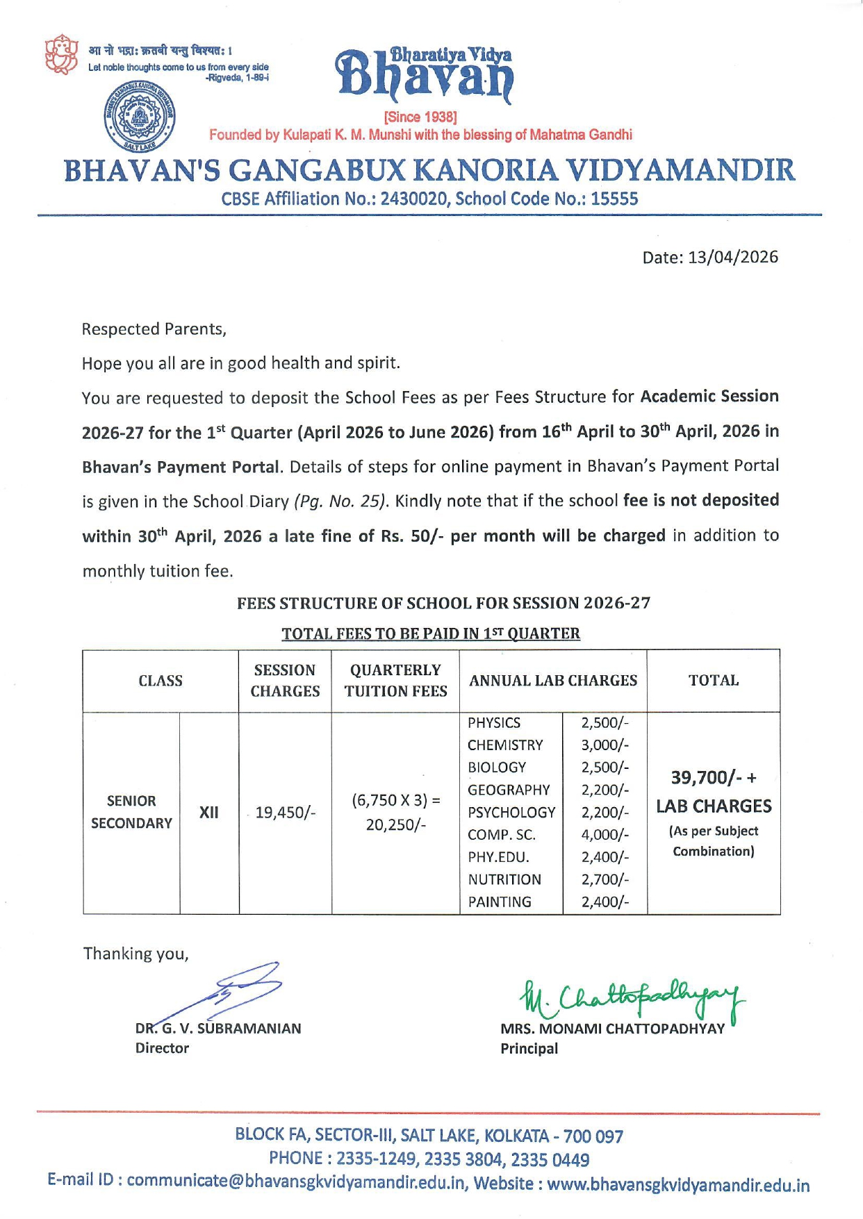 » Notice for First Quarter Tuition Fees Payment for class XII (Academic Session : 2026-27)
