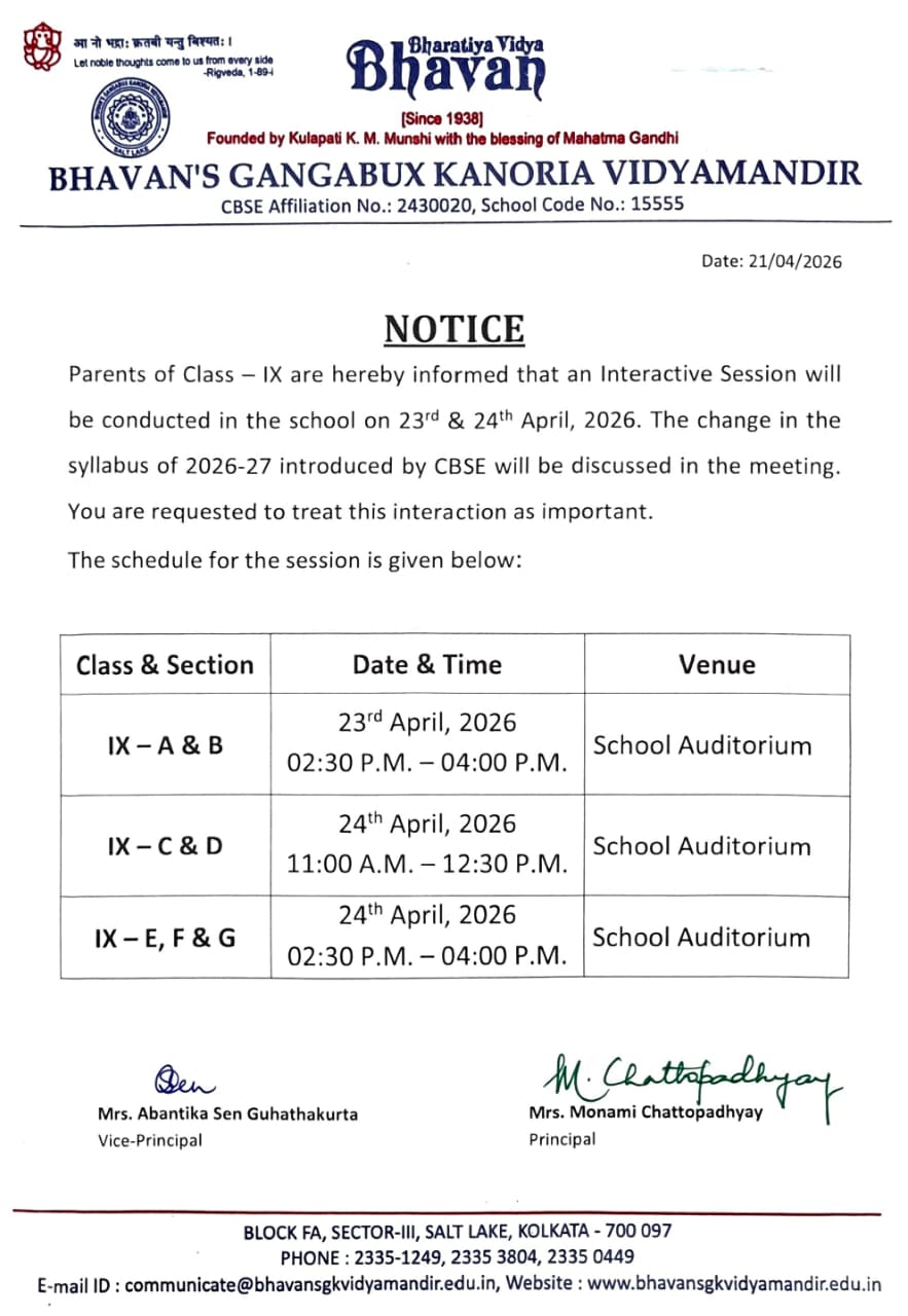 Parents of Class – IX are hereby informed that an Interactive Session will be conducted in the school on 23rd & 24th April, 2026